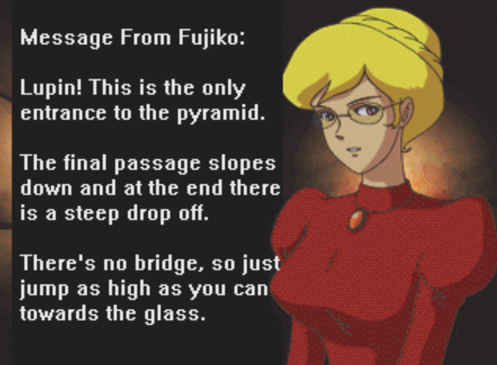 First released in 1998, Sage of Pyramid features our familiar red-jacket clad hero entering an ancient pyramid in an attempt to uncover some hidden riches. Not all is as it seems, as soon a mysterious ghostly figure of a cute girl appears, guiding Lupin through the maze. With armed guards and Zenigata both on his tail, has Lupin bitten off more than he can chew, or will he traverse the pyramids many traps and snag the treasure for himself? Not if Fujiko Mine can help it!